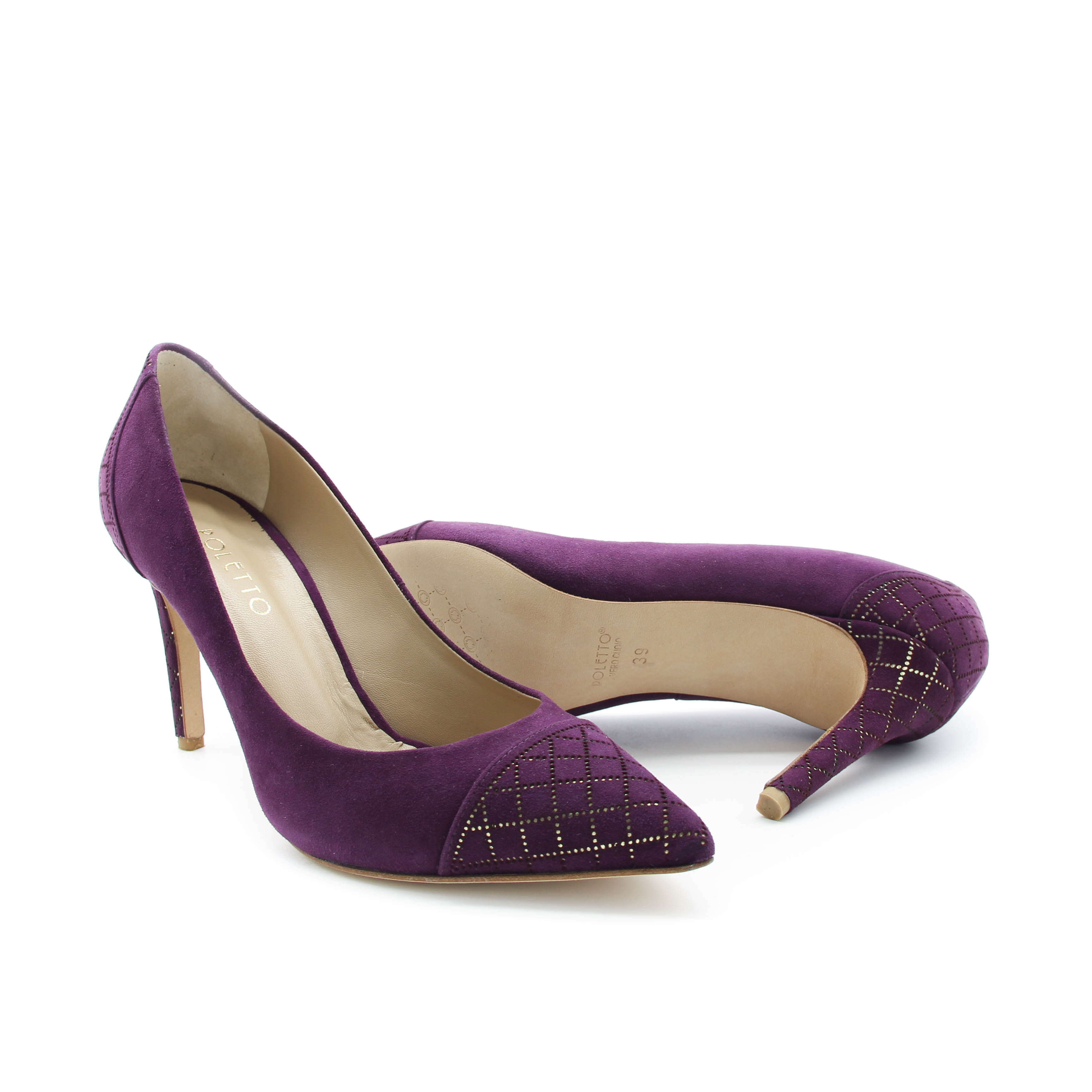 красивые фиолетовые туфли в золотистой отделкой. средний каблук и удобная колодка.